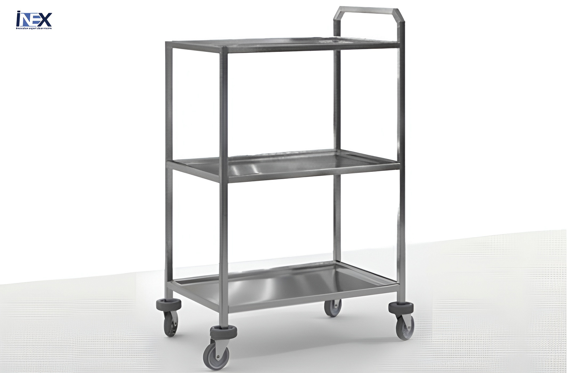 Марка стали AISI 304. Изготовлен из профильной трубы 20х20х1,5 мм и 20х20х1,5 мм и листа толщиной 1 мм. Конструкция - сварная, сборно-разборная. Возможность регулировки высоты. Снабжен пластиковыми колесными опорами на резиновом ходу диаметром 50 мм. Количество полок - 2 или 3 шт.